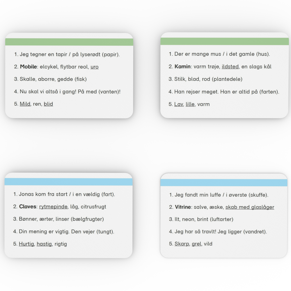 Synonymer: Her skal eleverne gentage de to ord, der betyder (næsten) det samme. Halvdelen af kortene inde-holder spørgsmål med udsagnsord, den anden halvdel spørgsmål med tillægsord.
