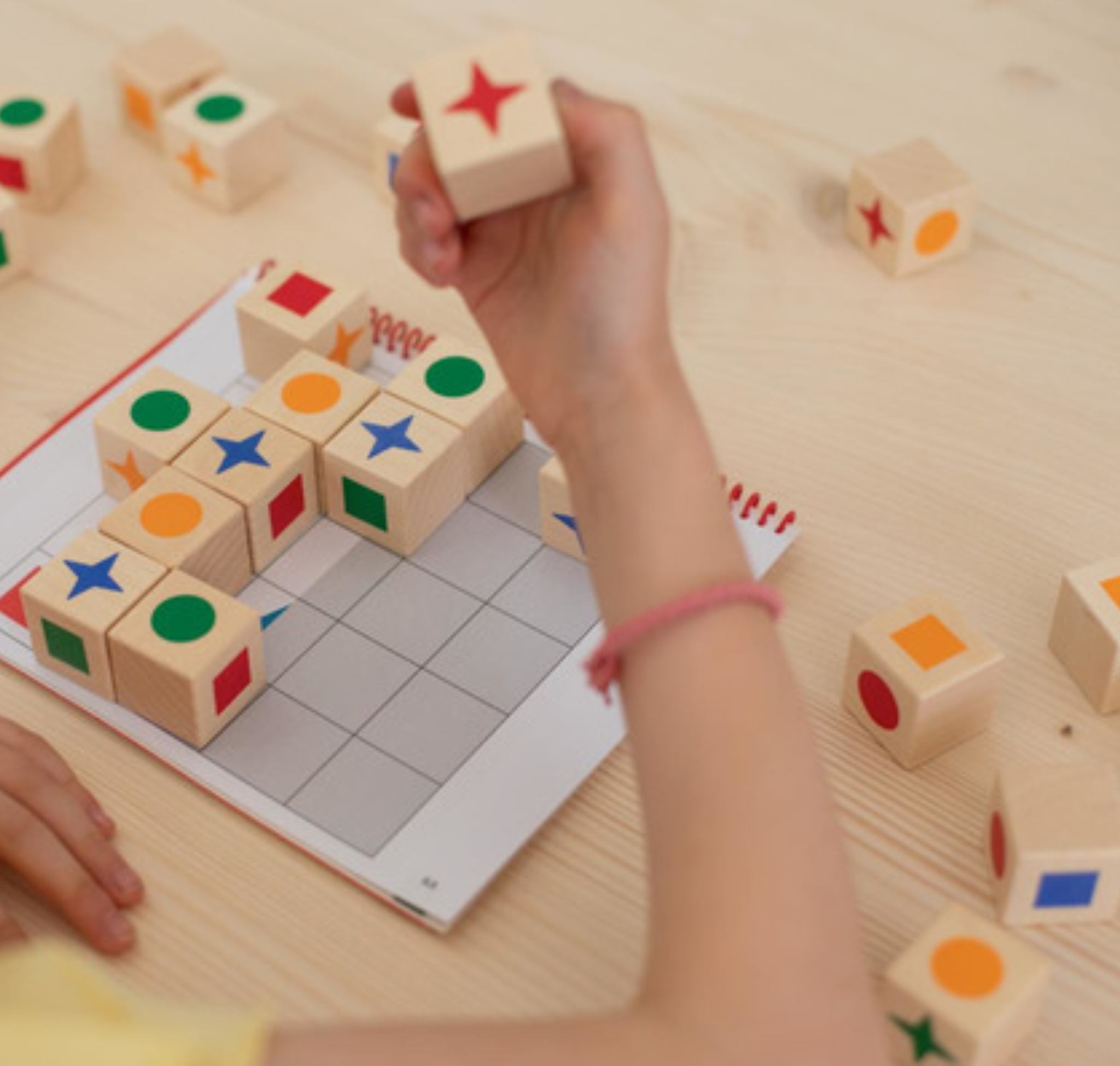 Materialet består af 24 farverige træklodser (3 cm), der kombineres efter medfølgende opgavehæfte med 74 sider fyldt med opgaver i stigende sværhedsgrad. Undervejs trænes koncentration, farve- og formgenkendelse, hukommelse og forståelse for symmetri. De enkle begyndelsesopgaver sikrer, at alle kan være med – og de mere udfordrende rækker giver stof til eftertanke, selv for voksne.
