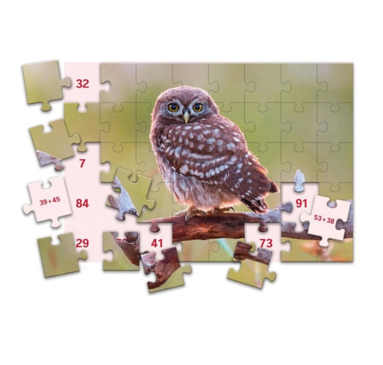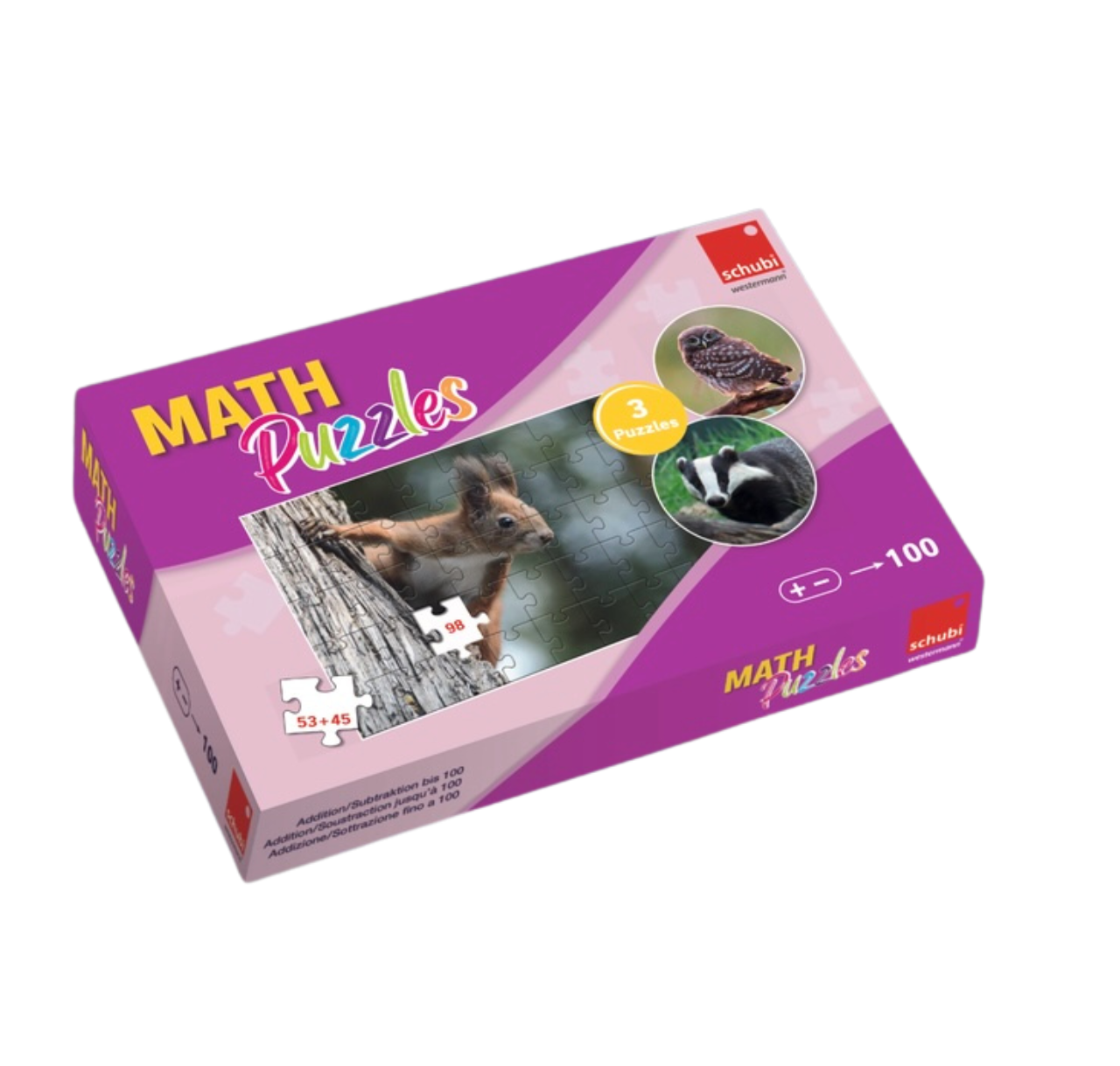 Sættet indeholder tre puslespil, hvor hvert enkelt brik har en regneopgave på bagsiden.