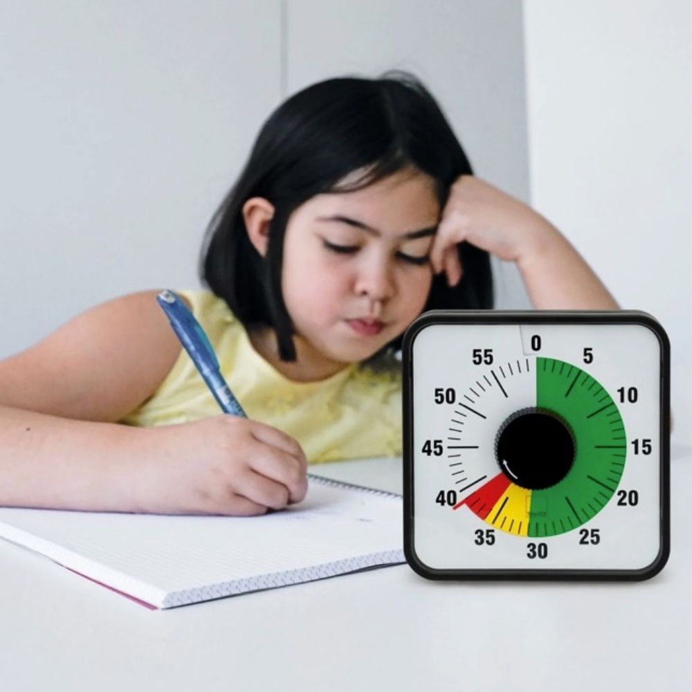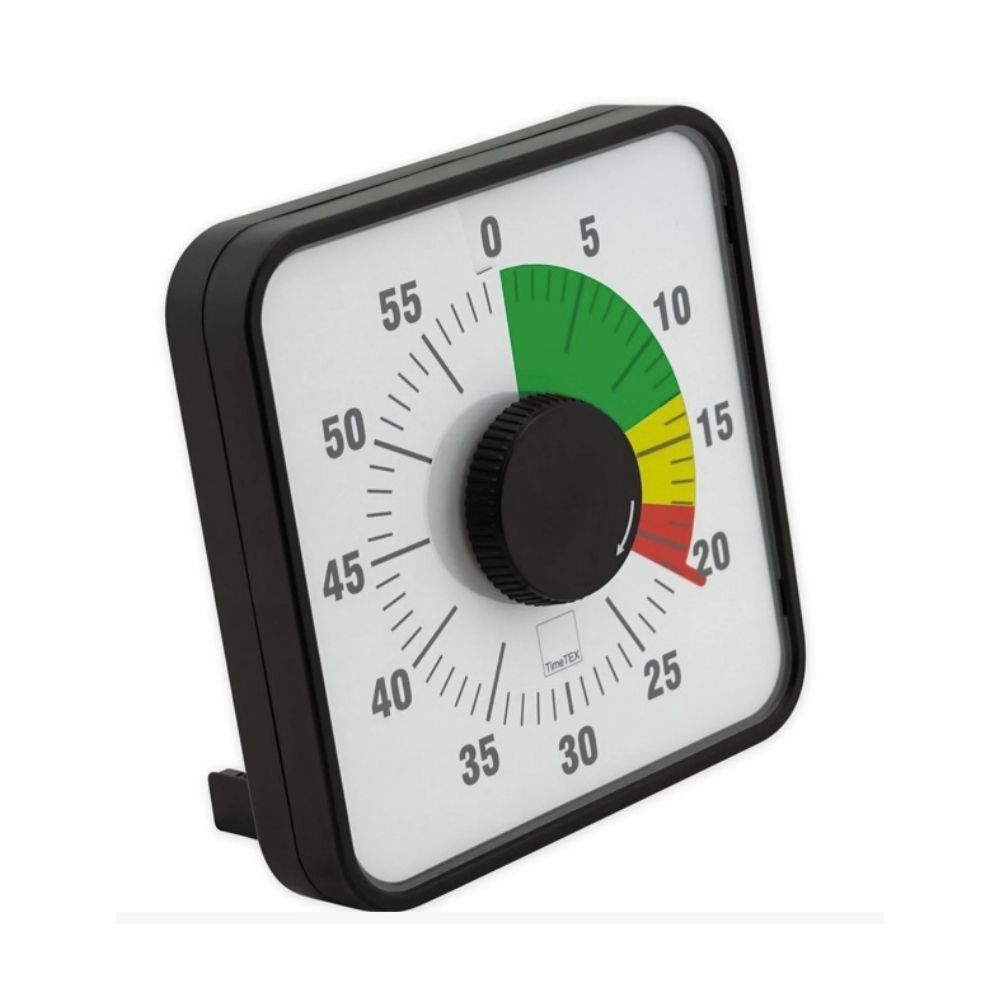 Dette magnetiske pædagogiske tidsur gør det nemt for elever at forstå, hvor meget tid der er tilbage. Den tydelige urskive viser tiden med en farvet trafiklysskive, hvor grøn betyder god tid, gul markerer de sidste 8 minutter, og rød viser de sidste 3 minutter før afslutningen. Når tiden er gået, lyder et akustisk signal.